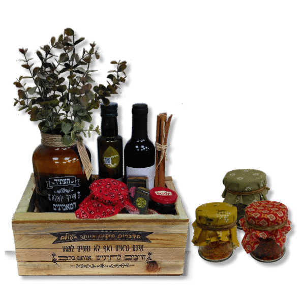 מארז עץ המכיל יין 375 מל', שמן זית 250 מל', אגרטל מזכוכית חומה עם אקליפטוס מלאכותי תערובת לבישול, חרוסת 120 גרם, ו-2 קוביות שקיקי תה מבית סרמוני ומקלות קינמון ארוכים מידת מארז: 30x13x15 ס"מ, תכולת האגרטל 1000 מ"ל