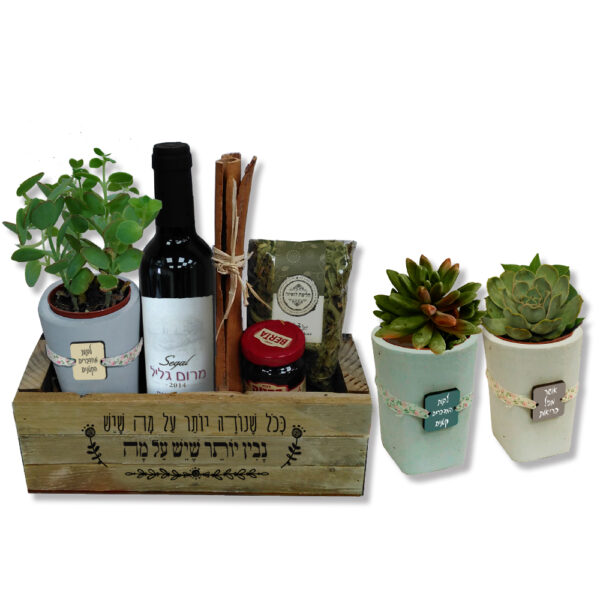 מארז עץ המכיל יין 375 מל', עציץ סקולנט, חרוסת 120 גרם, חליטת צמחים ומקלות קינמון ארוכים