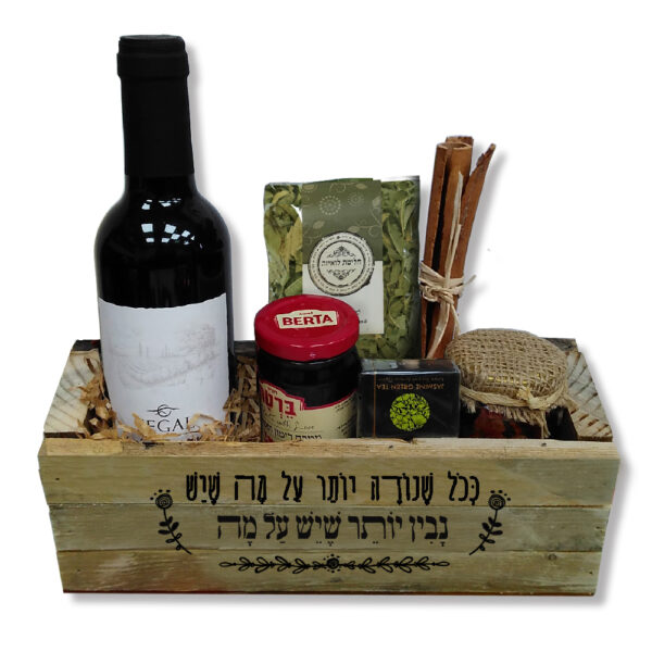 מארז עץ המכיל יין 375 מל', חרוסת 120 גרם, חליטת צמחים,חליטת פירות, מקלות קינמון ארוכים ושקית תה מבית סרמוני