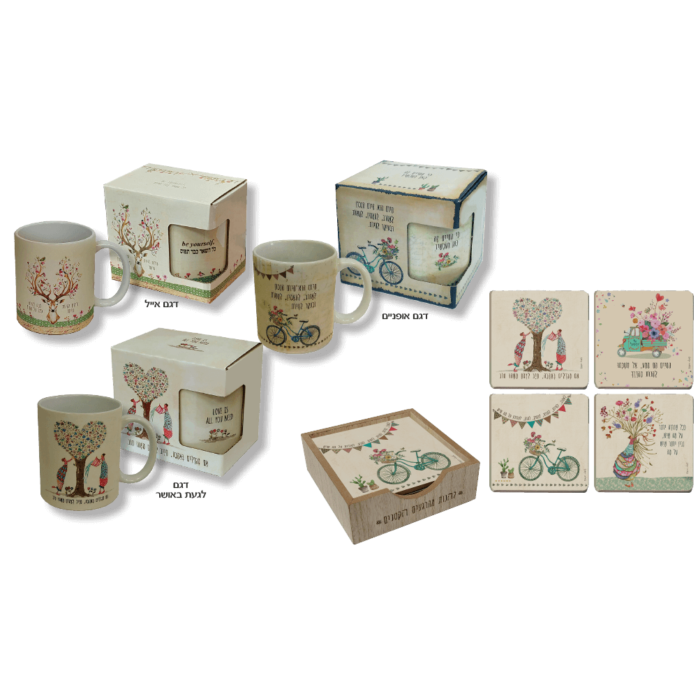 סט מתנה ייחודי לפסח הכולל: 🎁 ספל קרמיקה עם הדפס אמנותי לבחירה 🎁 4 תחתיות עץ איכותיות בעיצוב תואם 🎁 אריזת מתנה מוקפדת עם משפט השראה