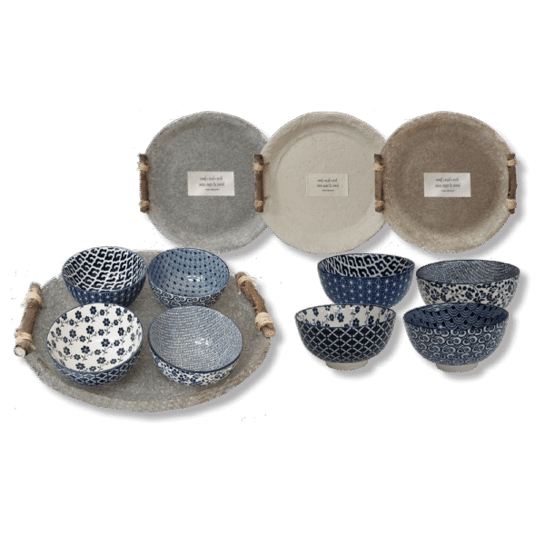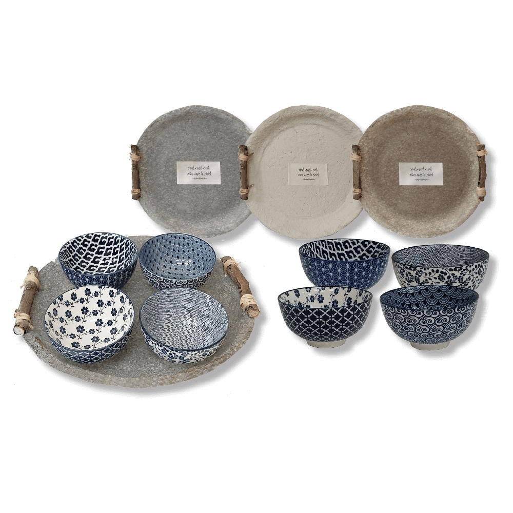 מארז הכולל מגש עגול ממוחזר בעבודת יד מעיסת נייר, בקוטר 32.5 ס"מ, עם ידיות חבל טבעיות. המגש כולל 4 קערות קרמיקה מודפסות בעיצובים משתנים – בגודל 11.5×6 ס"מ. הקערות אינן בעבודת יד, אך כל מגש מיוצר ידנית ומקבל מראה ייחודי בגוון, בגימור ובאופי.