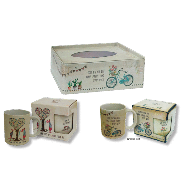 מתנה שמשלבת שימוש יומיומי עם נגיעה אישית: קופסת טישו וספל בעיצוב ייחודי במארז מעוצב ואלגנטי.