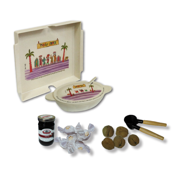 מארז ירון מכיל מגש למצה, כלי לחרוסת עם כפית, חרוסת 120 גר', מפצח אגוזים, 5 אגוזים ו-5 פרלינים