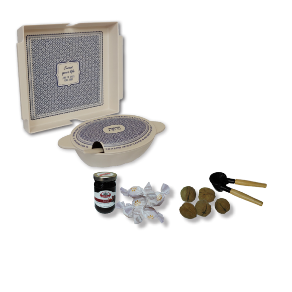 מארז ירון מכיל מגש למצה, כלי לחרוסת עם כפית, חרוסת 120 גר', מפצח אגוזים, 5 אגוזים ו-5 פרלינים