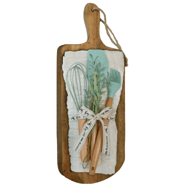 מתנה חגיגית לפסח הכוללת קרש חיתוך איכותי, מגבת מטבח מעוצבת, שלושה כלים לאפייה וצמח מלאכותי מקסים. שילוב של שימוש יומיומי ואווירה חמה – מתנה לפסח עם משמעות שמתאימה לעובדים וללקוחות.