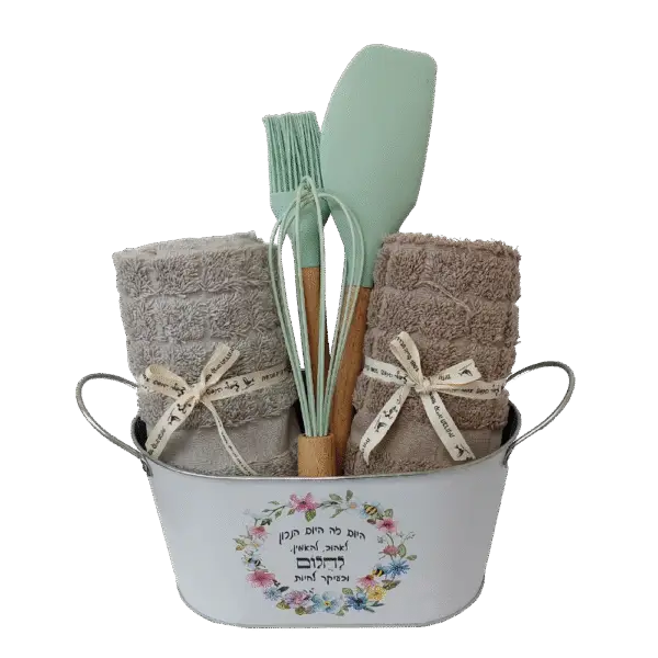 הסט כולל קופסת פח מהודרת ובתוכה 2 מגבות מטבח איכותיות ו-3 כלי אפייה שימושיים – בדיוק מה שצריך להכין איתו משהו מתוק לשבת משפחתית.