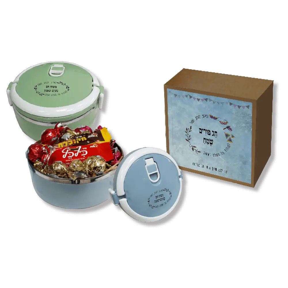מתנה פורים מקורית ושימושית במיוחד – קופסת אוכל תרמית השומרת חום וקור, עם רצועה אלסטית פנימית לסגירה בטוחה ונוחה. בתוך הקופסה מחכה הפתעה מתוקה: 5 פרלינים איכותיים ו-2 חטיפי שוקולד מפנקים, ליצירת חוויית חג מושלמת.