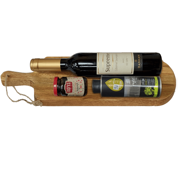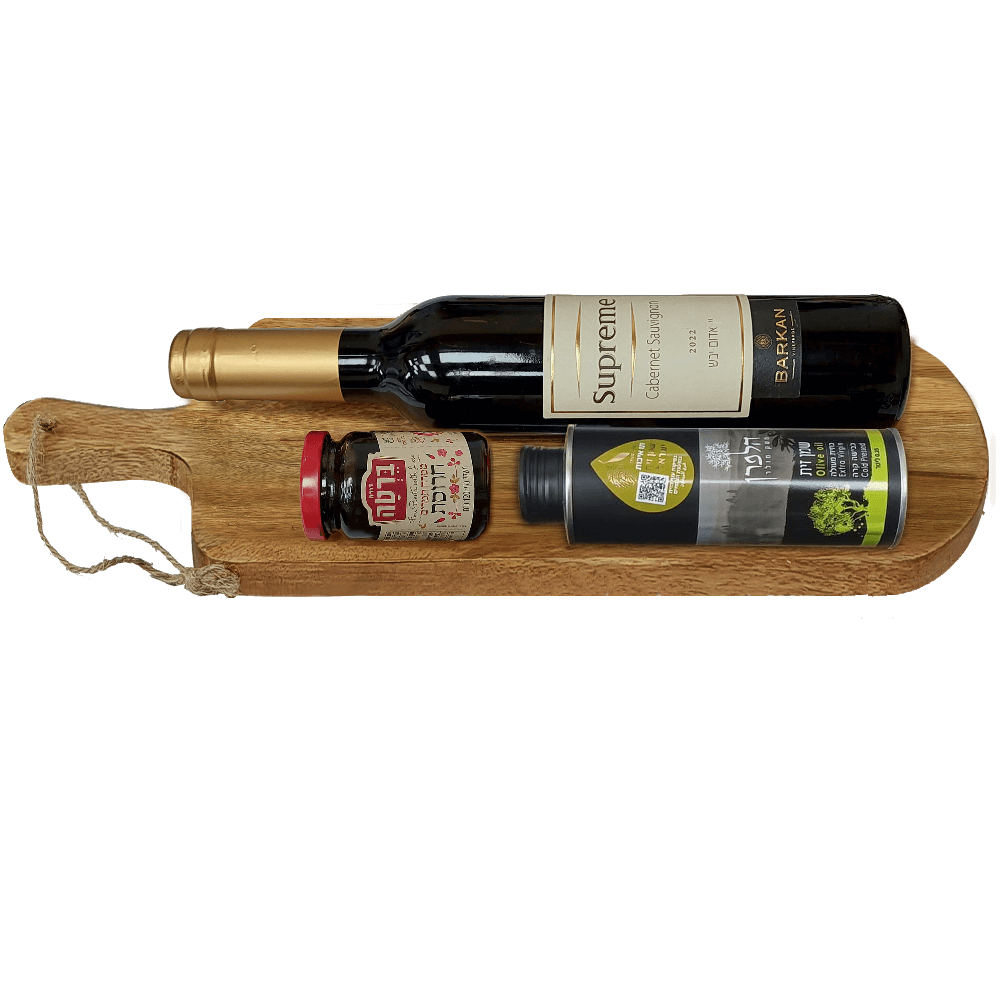 מארז חגיגי על קרש עץ יוקרתי הכולל בקבוק יין אדום 750 מ"ל, שמן זית איכותי וחרוסת מסורתית. מתנה לפסח עם משמעות עמוקה שמתאימה במיוחד ללקוחות או מנהלים. שי לפסח שמשלב איכות, מסורת ויוקרה – חוויה של חג באריזה אחת.