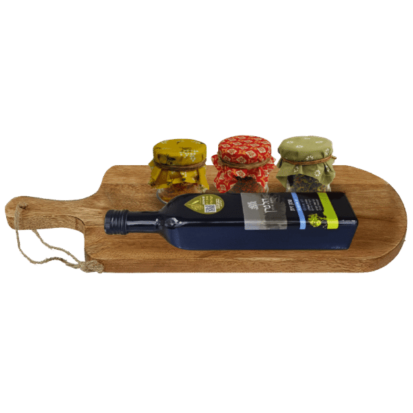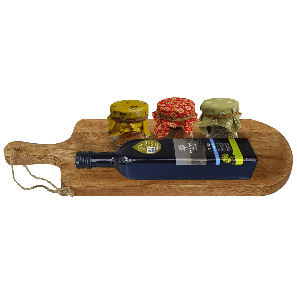קרש חיתוך איכותי מעץ מנגו, שמן זית 500 מ"ל ו-3 תערובות בישול מיוחדות. מתנה לפסח שמדברת אל לב המטבח הישראלי – חג, טעמים ואווירה ביתית. מתאימה במיוחד למי שמחפש מתנות לפסח שימושיות עם ערך קולינרי ברור.