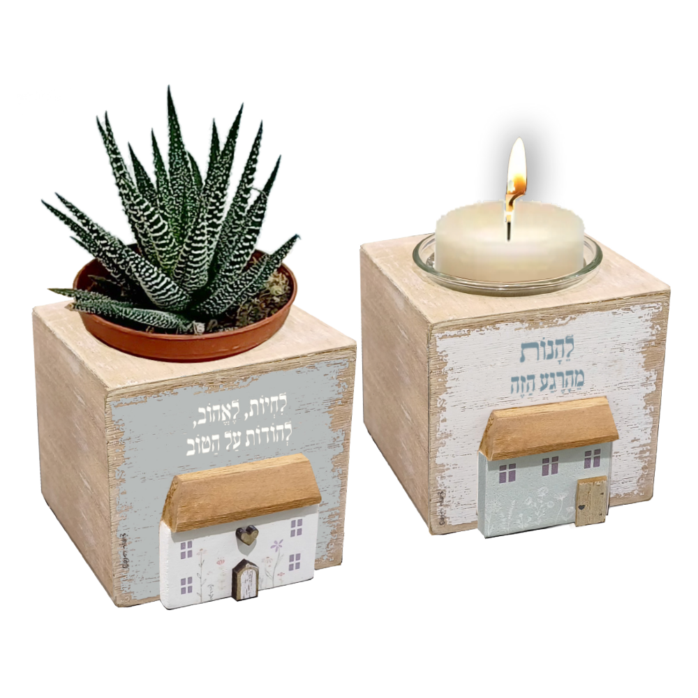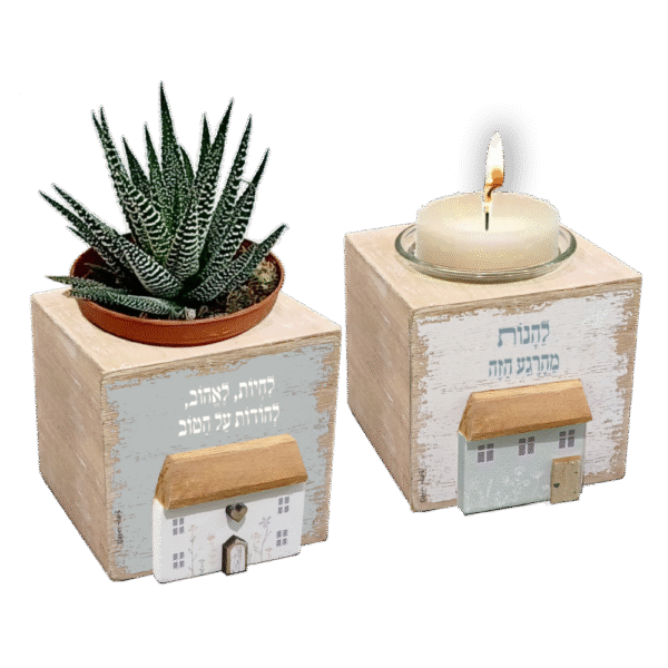 מארז עיצובי הכולל סטנד עץ קטן (8×8×8 ס"מ) עם נר ריחני וסטנד נוסף לעציץ קטן.