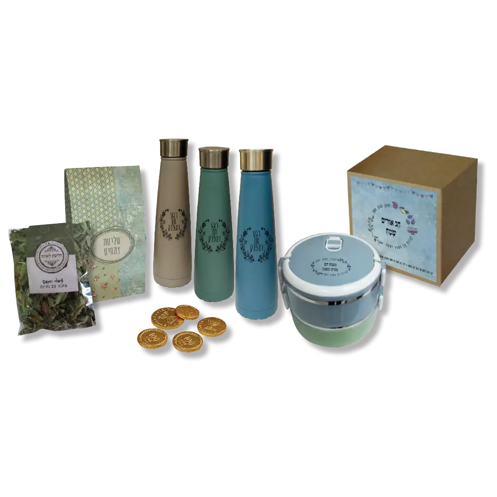 סט המורכב מ-2 קופסאות אוכל תרמיות שומרות חוםקור עם נירוסטה איכותית פנימית, תרמוס, חליטת צמחים ו-5 מטבעות שוקולד