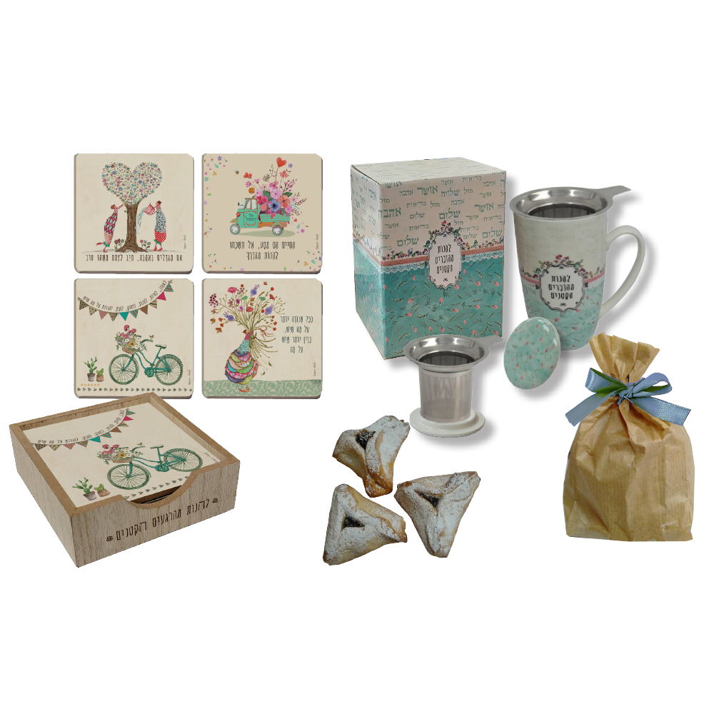 סטנד מהודר עם 4 תחתיות עץ מעוצבות, ספל תה איכותי עם דיפיוזר לחליטה – ותוספת טעימה במיוחד: 3 אוזני המן עטופות בשקית נייר.