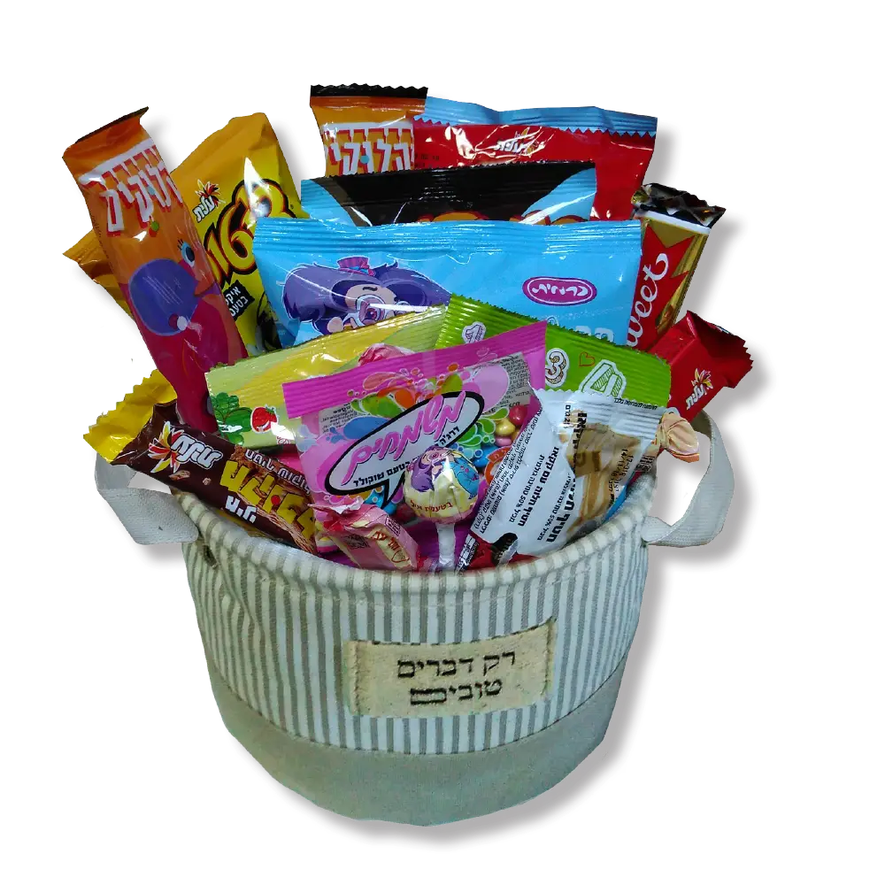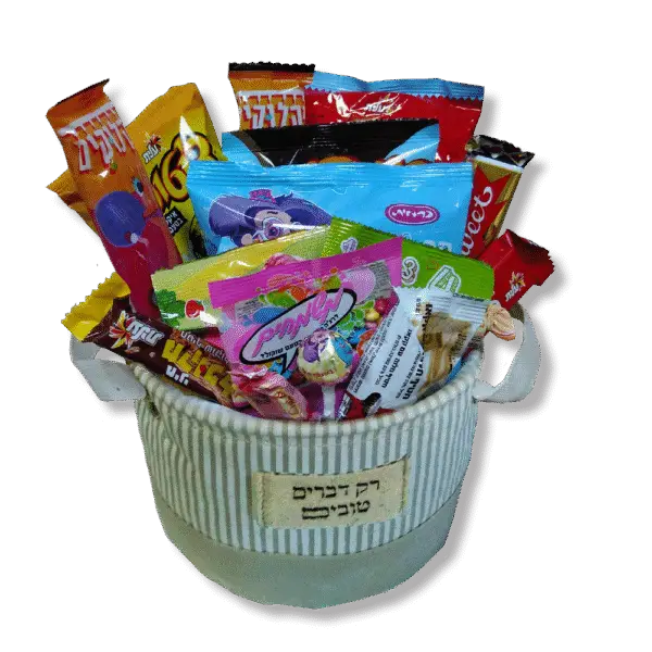 סלסלה עם צ'יטוס, דוריטוס, תפוצ'יפס, 2 גלילנד, מרשמלו, 2 מקלות חמוצים, וופל מצופה, עדשים, חלווה, 2 חטיפי שוקולד, לקקן, 5 סוכריות טופי מידת הסלסלה 15×19 ס"מ