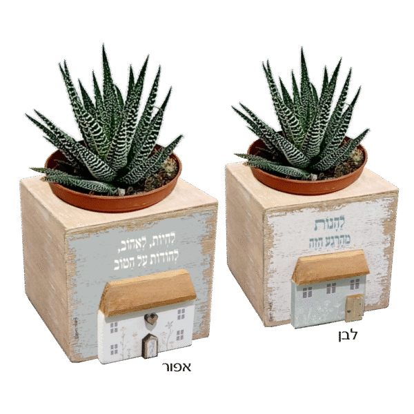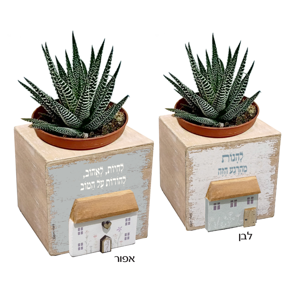 מעמד עץ ייחודי הכולל עציץ סוקולנט חי, בעיצוב כפרי מקסים עם בית קטן וציטוט מעורר השראה. העציץ משולב בעציץ טרקוטה עגול ושתול בתוך מעמד עץ בעבודת יד, בגודל קומפקטי של 8×8 ס"מ שמתאים לכל שולחן או מדף.