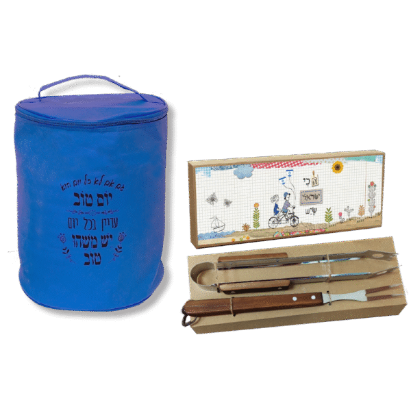 מארז מושקע לפסח הכולל צידנית עגולה (30×24 ס"מ) וסט כלים איכותי לצלייה (13×37 ס"מ).