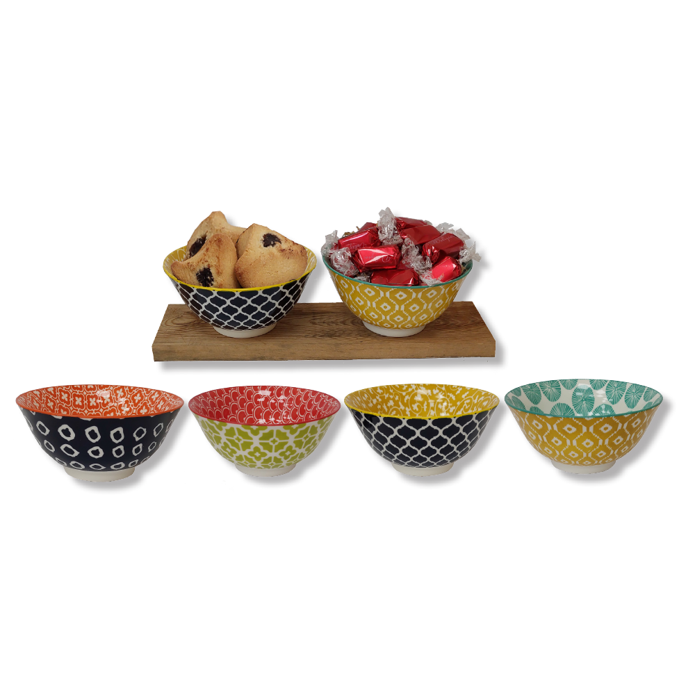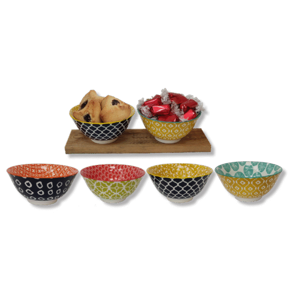 הקערות מגיעות במגוון צבעים ודגמים בהתאם למלאי, ומוגשות על גבי קרש עץ פשוט (לצורכי אריזה בלבד).