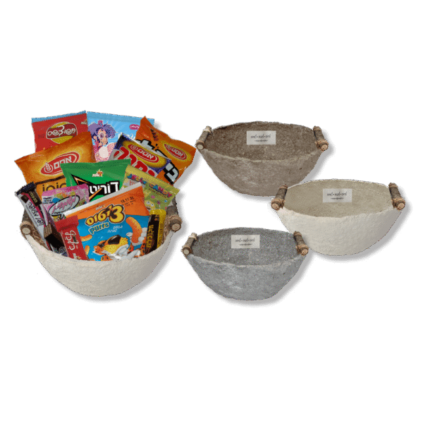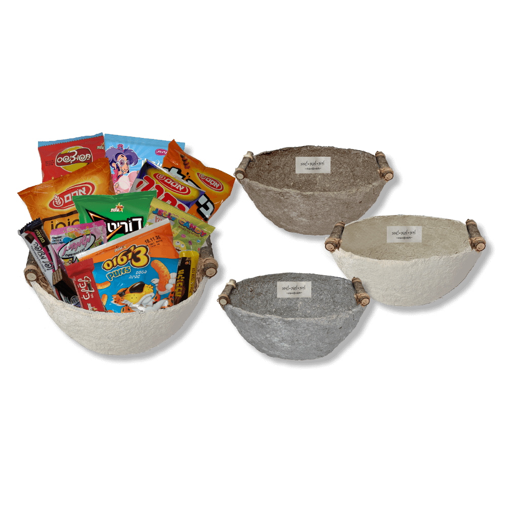 מארז פורים צבעוני, מפנק ובעל ערך אקולוגי – קערה ממוחזרת מעיסת נייר, מלאה בכל טוב: במבה, אפרופו, תפוצ’יפס, מרשמלו, שוקולד מצופה, דוריטוס, ביסלי, עדשים, ג’לילנד וצ’יטוס.