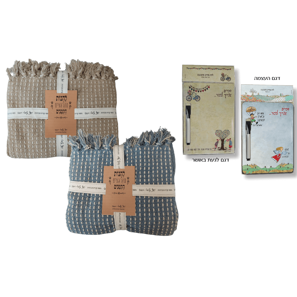 מארז ייחודי ומחבק הכולל שמיכת כותנה רכה בגודל 130×170 ס"מ, ולוח מחיק מעוצב בגודל 15×20 ס"מ עם טוש תואם ומסר מעורר השראה.