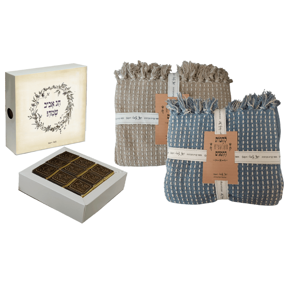 מארז מתוק ומחמם הכולל שמיכת כותנה רכה בגודל 130×170 ס"מ, יחד עם מארז פרלינים איכותיים משוקולד מריר 70% (במארז עץ בעיצוב אביבי: "חג אביב שמח").
