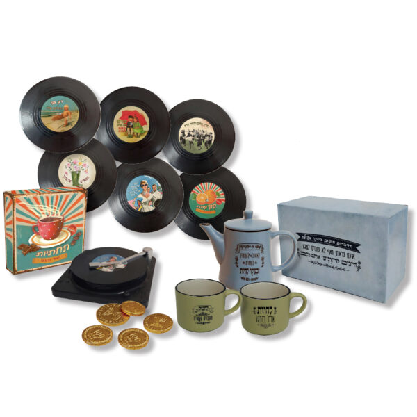 6 תחתיות תקליטים במארז פטיפון מעוצב, מארז קנקן 420 מ"ל, 2 ספלים 200 מ"ל ו-5 מטבעות שוקולד מידת המארז: 13.5×20.5×10 ס"מ