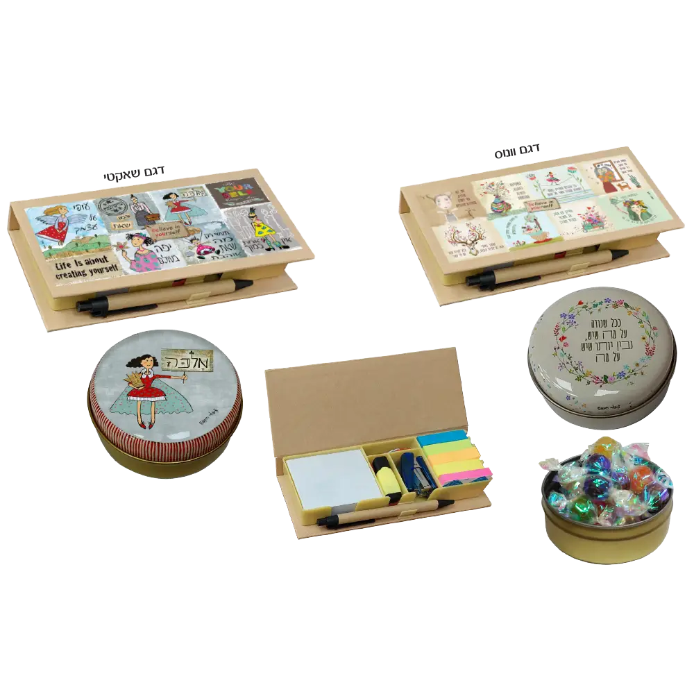 קופסת פח מעוצבת עם כ־15 סוכריות יהלום צבעוניות, בצירוף אורגנייזר שולחני עם שלל פריטים שימושיים: ✦ דפי ממו | עט | מרקר | שדכן | סיכות מהדק | דבקיות מתנה לאישה שאוהבת סדר, טעם טוב ועיצוב מוקפד. מתנות לנשים שהן גם יפות, גם שימושיות וגם מרשימות.