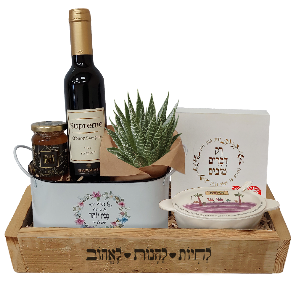 מארז פסח מיוחד בארגז עץ ממוחזר בגודל 38×15 ס"מ, שמשלב בין מסורת, מתיקות ועיצוב ירוק. המארז כולל קופסת פח בגודל 20×9.5×10 ס"מ עם בקבוק יין אדום 375 מ"ל, חרוסת מסורתית במשקל 120 גרם, כלי לחרוסת מבמבוק עם כפית תואמת בגודל 19x9x6 ס"מ, מארז נפוליטנים מתוקים, ועציץ סוקולנט חי בקוטר 9 ס"מ – פריט ירוק שמוסיף חיים לכל שולחן חג.