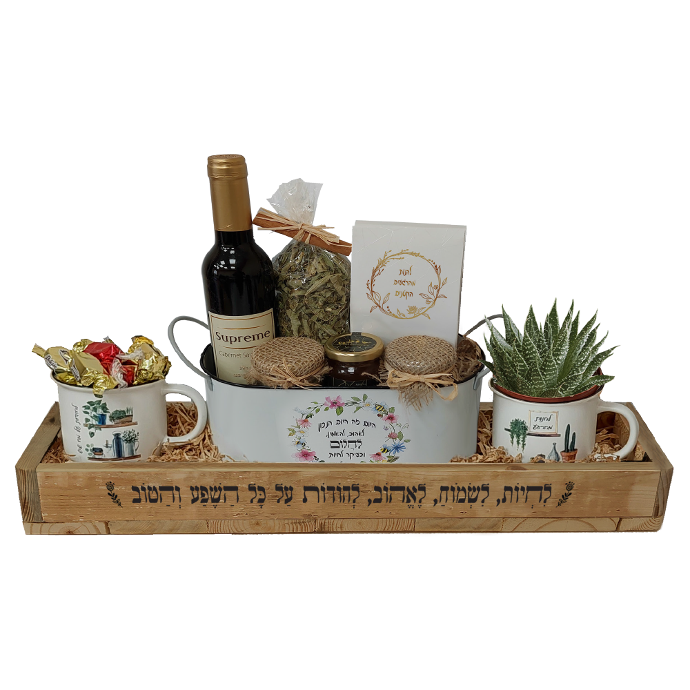 מארז חג ייחודי, מרשים ומוקפד באריזת עץ ממוחזר בגודל 54×17 ס"מ, הכולל קופסת פח מהודרת בגודל 24x12x12 ס"מ. המארז כולל בקבוק יין אדום 375 מ"ל, מארז שוקולד עם בוטן בעיטוף שוקולד לבן וקרמל מלוח, חרוסת חגיגית במשקל 120 גרם, שתי חליטות פירות מרעננות, חליטת צמחים בתוספת קינמון, עציץ סוקולנט חי שמכניס נגיעה ירוקה, שני ספלים קרמיים מעוצבים ו-5 פרלינים איכותיים.