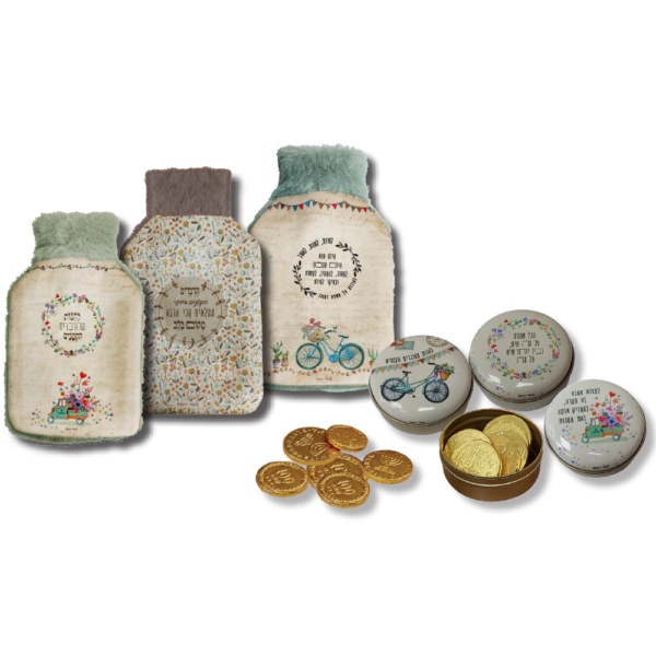 בקבוק חימום עם פרווה וקופסת פח עם 6 מטבעות שוקולד גדולות תכולת הבקבוק 1000 מ"ל