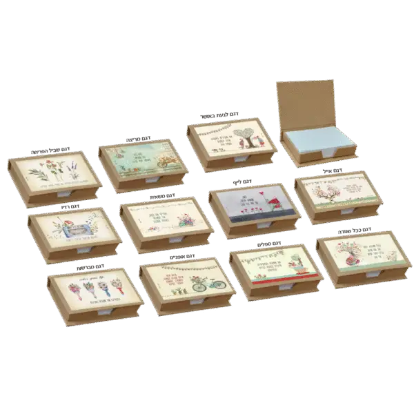 הדפים זמינים במגוון עיצובים מרהיבים: ככל שנודה, מריצה, לגעת באושר, אייל, לייף, משאית, אופניים, ספלים.