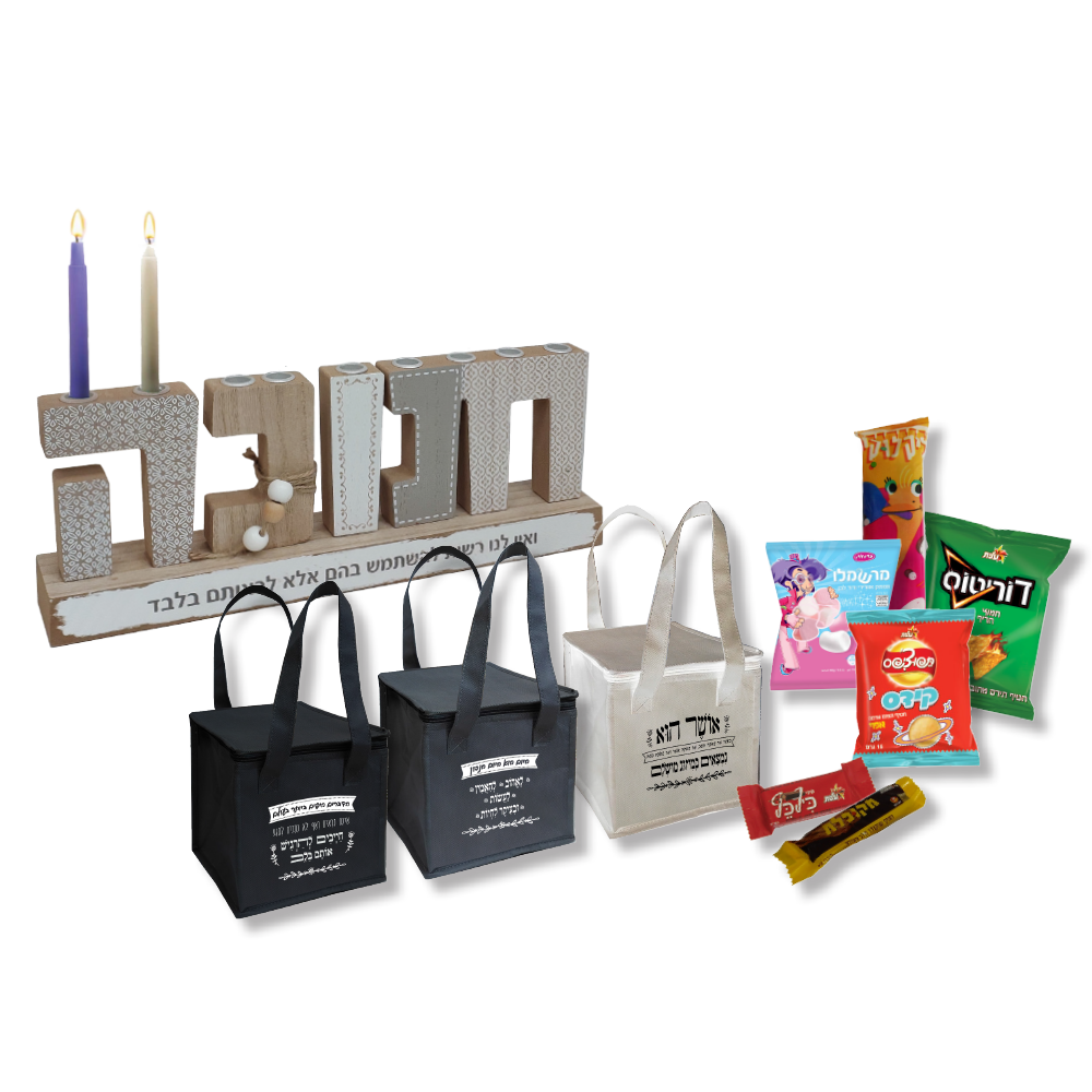 חנוכיה מעוצבת, צידנית אישית עם תפוצ'יפס, מרשמלו, דוריטוס, מקלות חמוצים