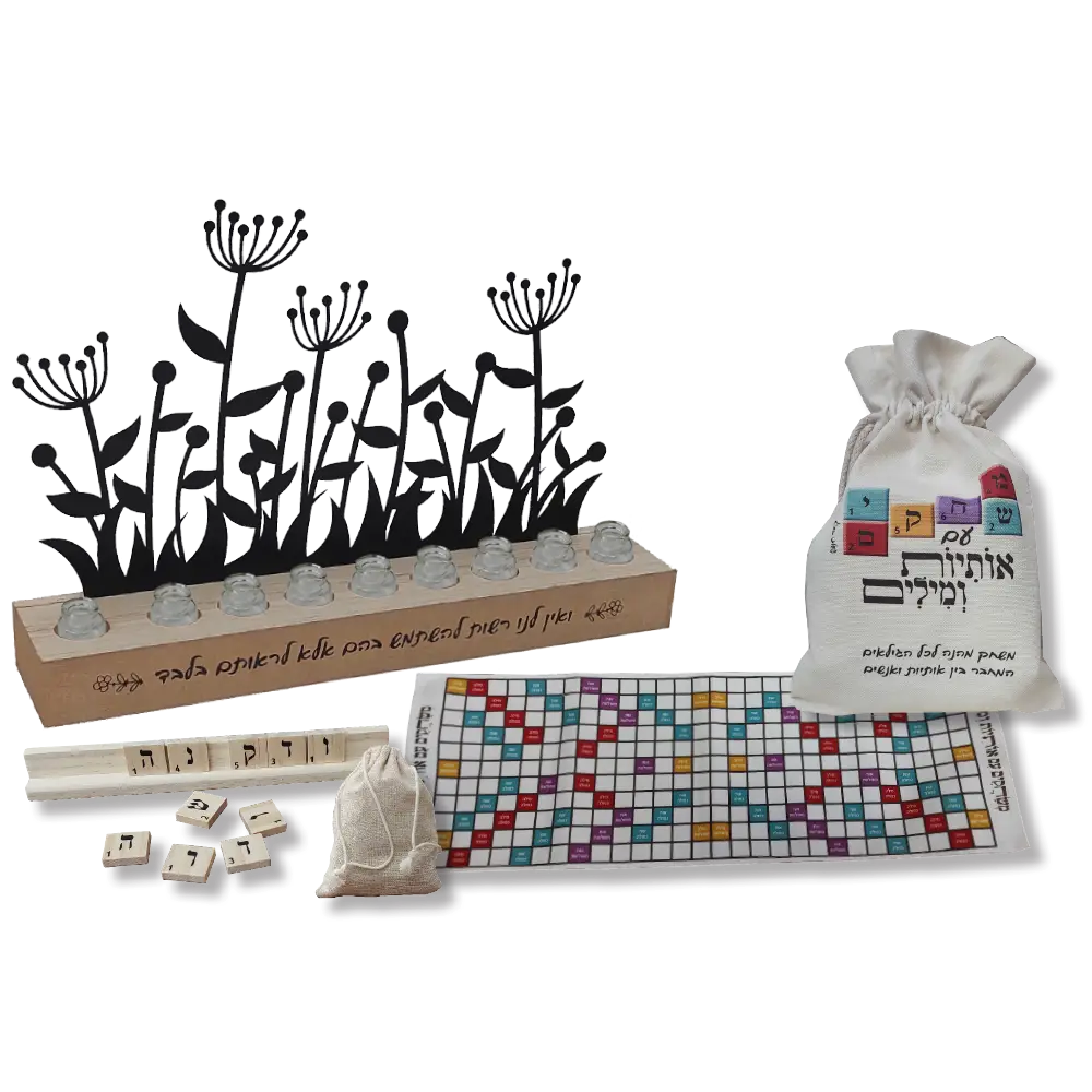 חנוכייה ייחודית עם פיתוחי ברזל על בסיס עץ בגודל 30x20x6 ס"מ, בעיצוב מרשים ואלגנטי. לצדה מצורף משחק אותיות ומילים בסגנון סקרבל – כולל 4 לוחות עץ, 96 אותיות על ריבועי עץ, לוח משחק ושקית כותנה איכותית. שילוב מקורי שמחבר בין מסורת החג לבין חוויה משפחתית מהנה. מתנה מושלמת לעובדים, ללקוחות או למשפחה בחנוכה.