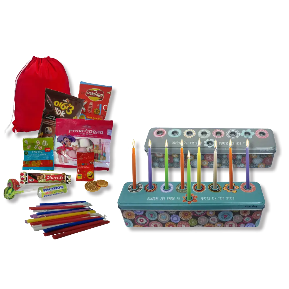 חנוכיית פח עם 44 נרות חנוכה ותיק גב במילוי ממתקים – חטיף צ'יטוס, תפוצ'יפס, מיני מרשמלו, גלילנד, שקית עדשים, מיני מנטוס, ופל מצופה, 2 לקקנים, 2 מטבעות שוקולד מידות החנוכיה: 21.5×4.5×5.5 ס"מ החנוכיות מגיעות במיקס מהדגמים לפי הקיים במלאי