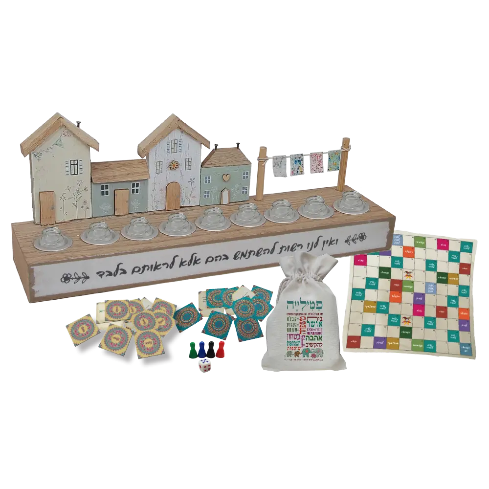 חנוכייה מעוצבת בסגנון בתים עם קנים מזכוכית, בגודל 30x12x7.5 ס"מ, המבטיחה הדלקה בטוחה ונעימה. לצד החנוכייה מצורף משחק "פמיליה" – משחק מהנה להעמקת הקשר המשפחתי, הכולל לוח בד וכרטיסי שאלות. ניתן להזמין גם ערכת כרטיסים נוספת להרחבת המשחק להיכרות חברתית. שילוב מיוחד של חנוכייה מעוצבת עם פעילות מגבשת – מתנה ייחודית לעובדים, ללקוחות או למשפחה בחג החנוכה.