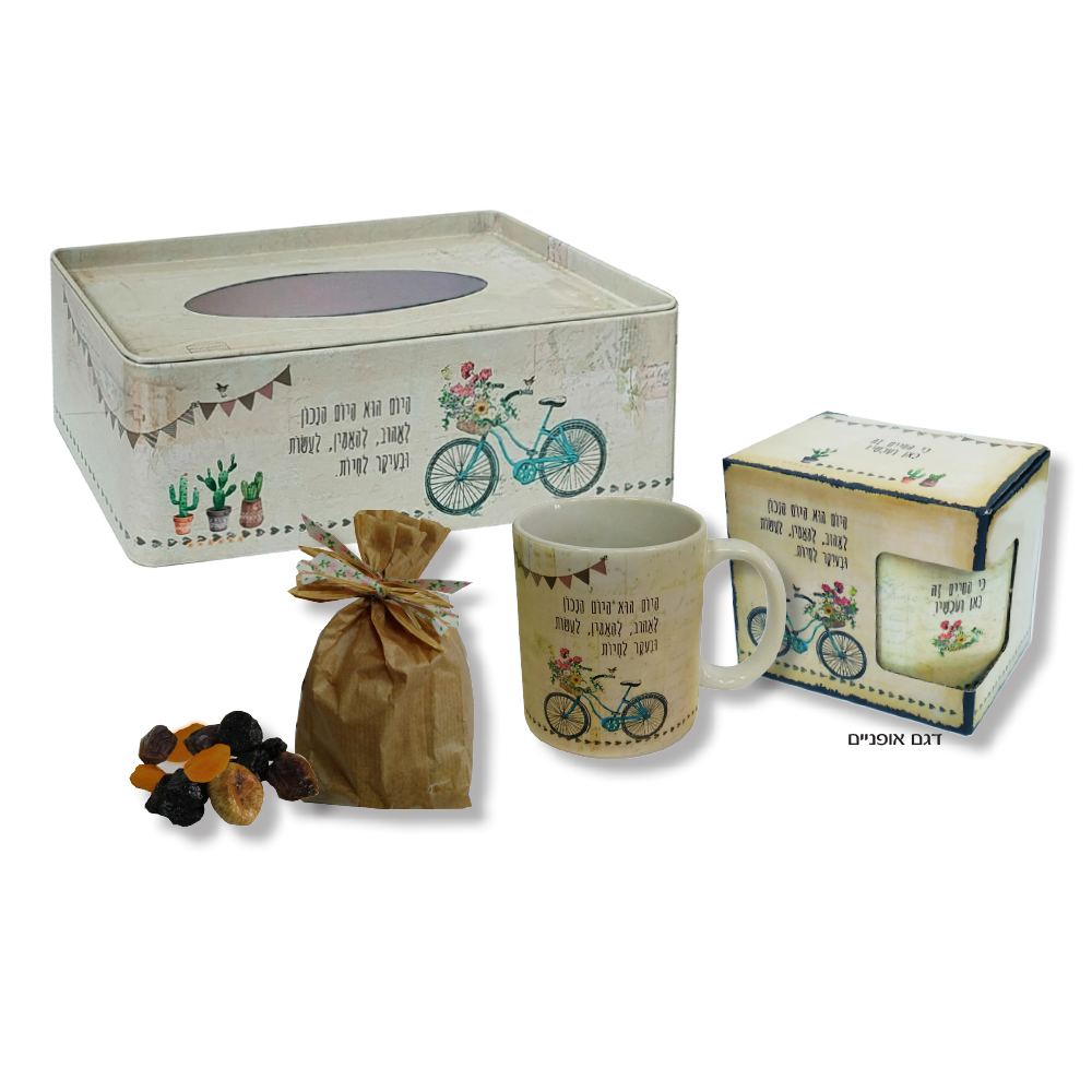 מארז עשיר ומלא טעם – קופסת טישו מעוצבת, ספל לבחירה מהמלאי ו-100 גרם של פירות יבשים משובחים.