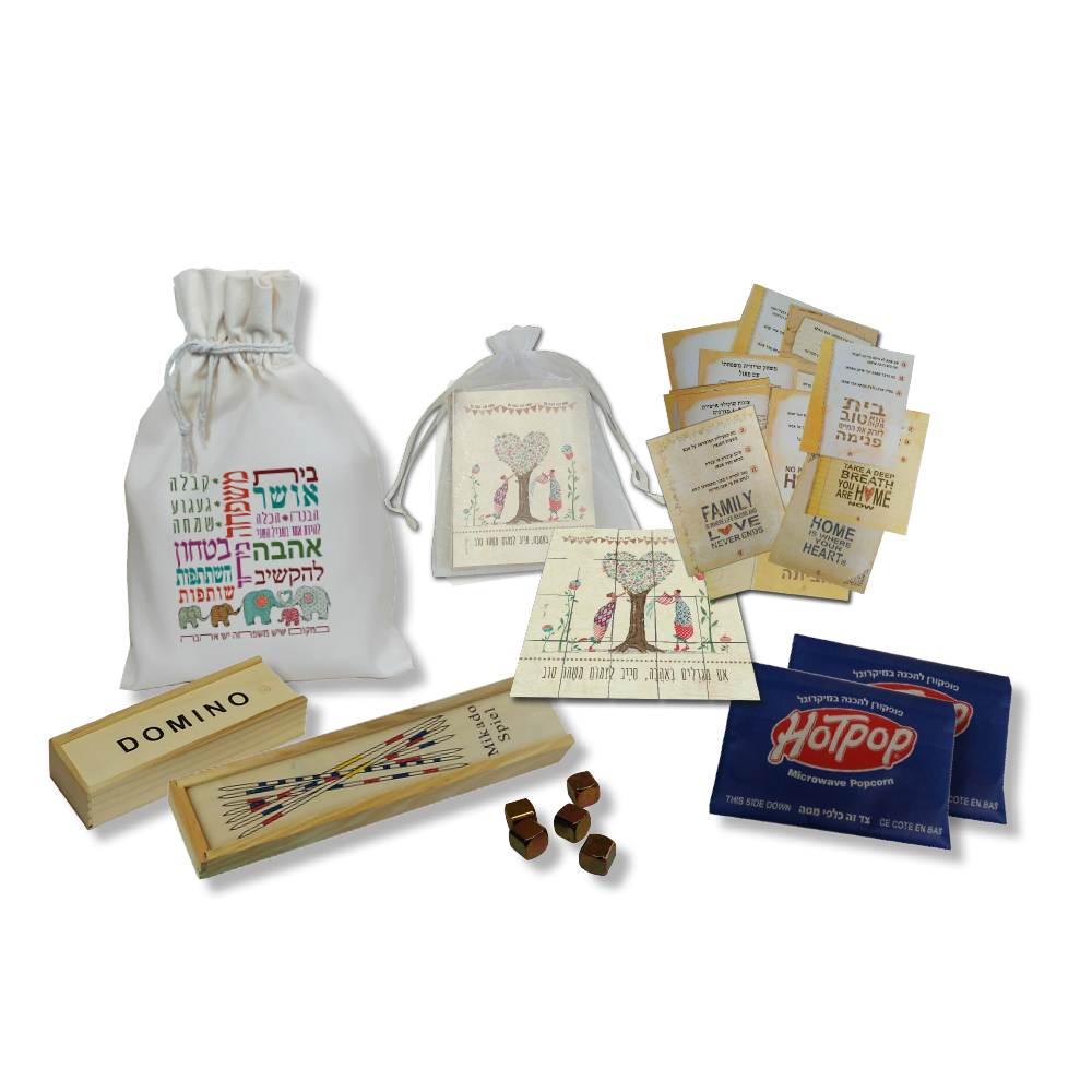 שקית כותנה עם משחקי טריוויה, דוקים, דומינו ו-5 אבנים ו-2 שקיות פופקורן גודל השקית 22×36 ס"מ