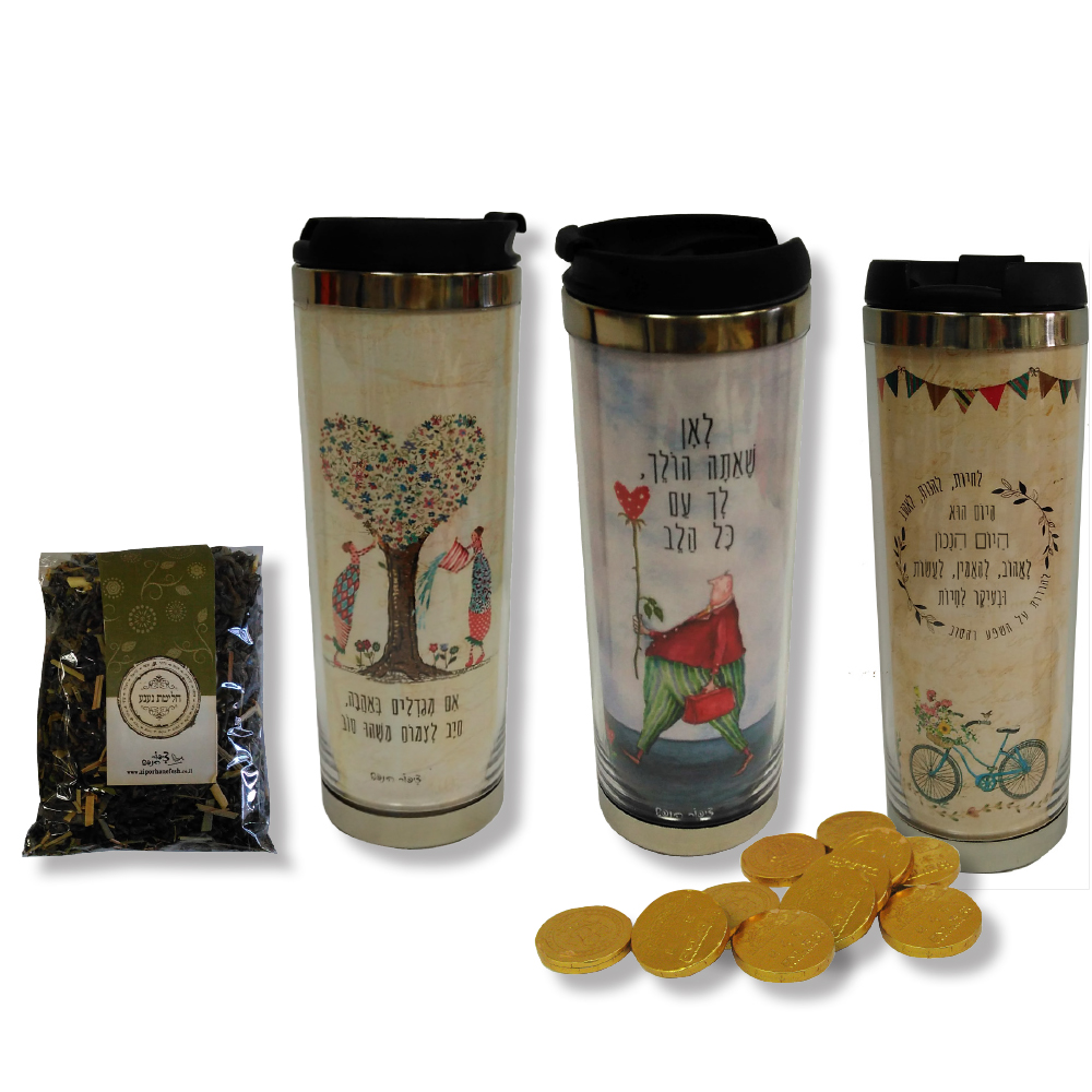 כוס טרמית עם חליטת צמחים ו-5 מטבעות שוקולד מידות הכוס 20×7 ס"מ