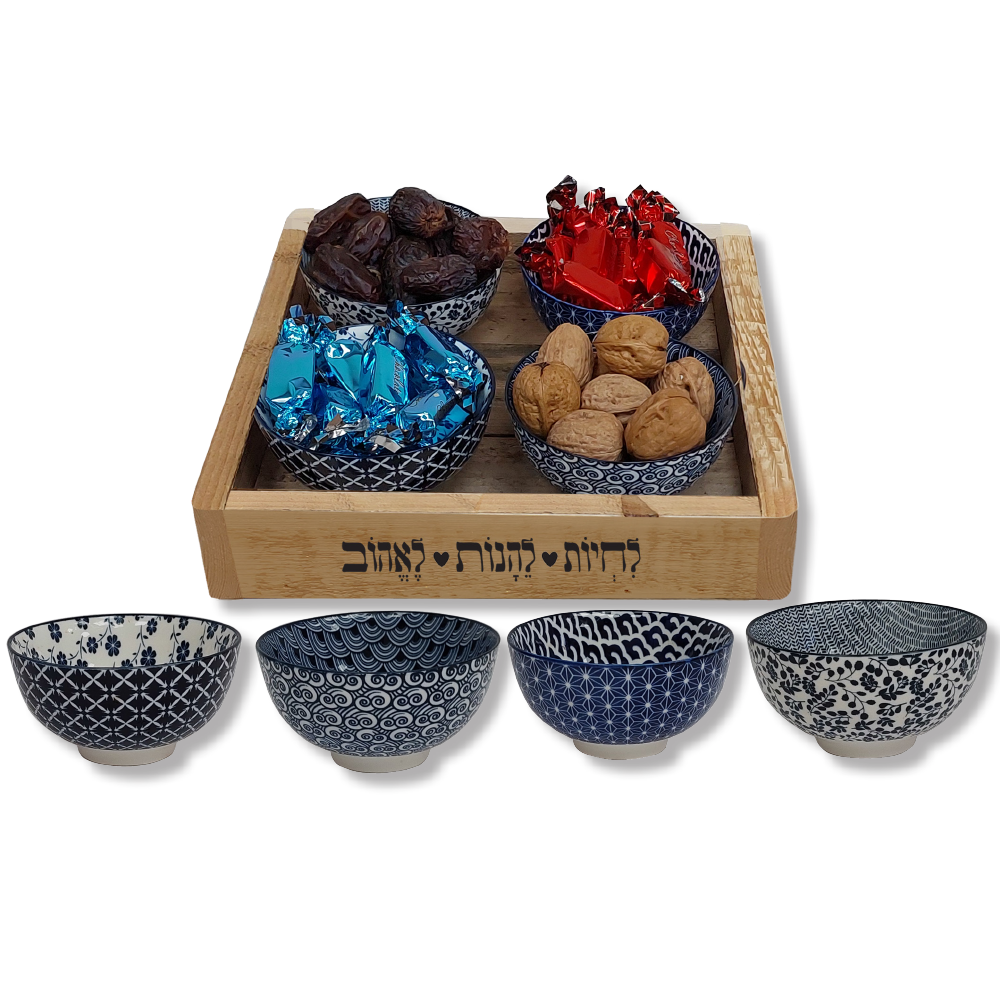 4 קעריות במגש עץ עם 200 גרם תמרים, 10 אגוזים ו-20 פרלינים גודל הקערית 11.5×6 ס"מ, גודל מגש 28.5×28.5