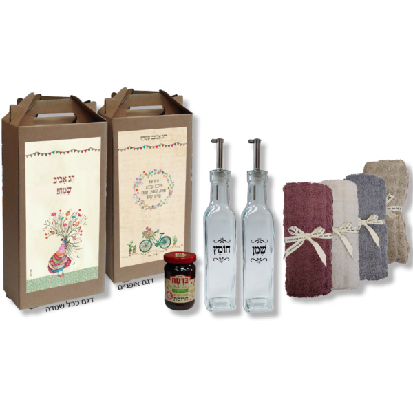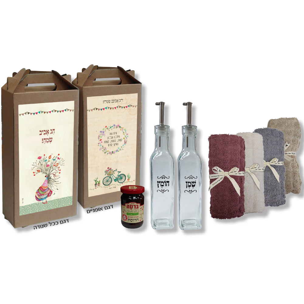 מארז המכיל 2 בקבוקים לשמן ולחומץ, חרוסת 120 גרם ומגבת מטבח המגבת מגיעה בגוונים שונים בהתאם לקיים במלאי, גודל המארז 34×17 ס”מ