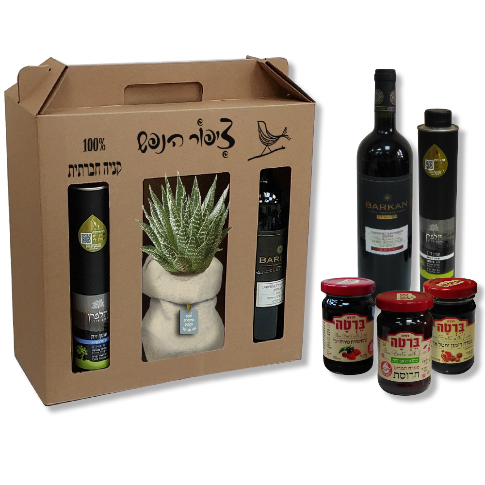 מארז המכיל יין ברקן 750 מל', שמן זית בגליל פח 500 מל', 2 ממרחים מתוקים 120 גרם,חרוסת 120 גרם ועציץ בטון דמוי שק עם סקולנט