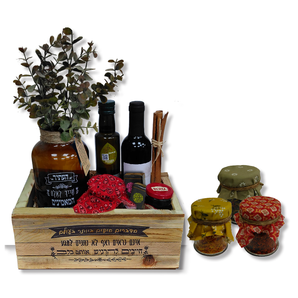 מארז עץ המכיל יין 375 מל', שמן זית 250 מל', אגרטל מזכוכית חומה עם אקליפטוס מלאכותי תערובת לבישול, חרוסת 120 גרם, ו-2 קוביות שקיקי תה מבית סרמוני ומקלות קינמון ארוכים מידת מארז: 30x13x15 ס"מ, תכולת האגרטל 1000 מ"ל
