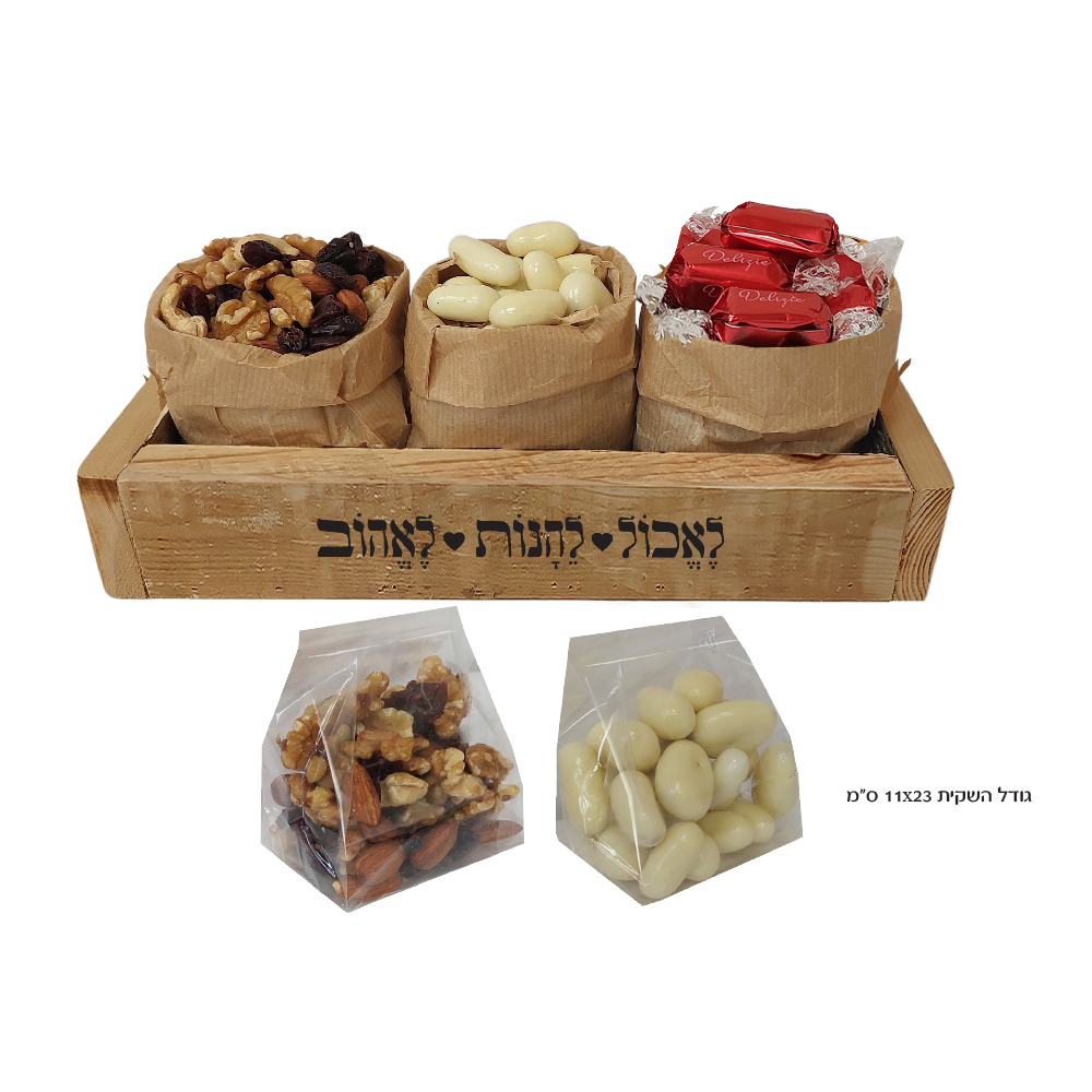 ארגז מעץ ממוחזר בגודל 30×11 ס"מ, המכיל קשיו בציפוי שוקולד לבן (100 גרם), 5 פרלינים איכותיים ומיקס בריאות 100 גרם. כל התכולה מונחת על מצע קש בתוך שקיות קראפט בגודל 11×23 ס"מ.