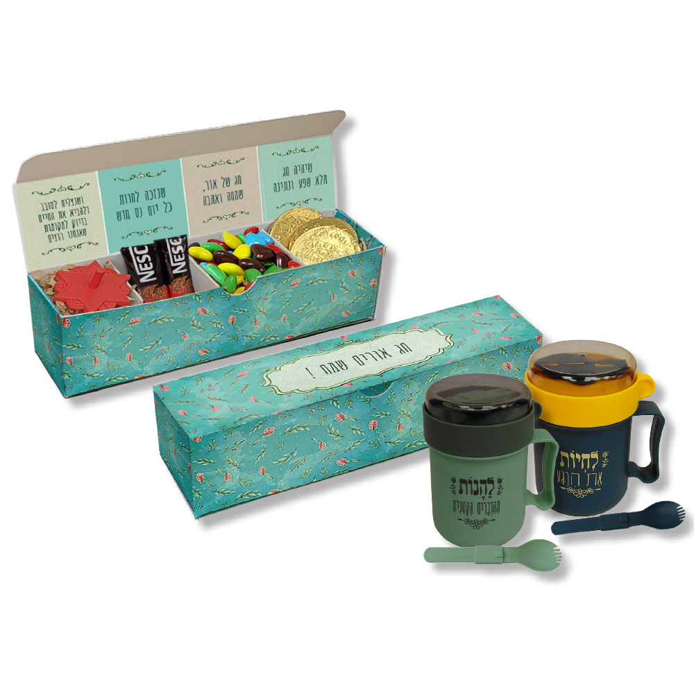3 מטבעות שוקולד, עדשים, 2 שקיות נס קפה אישי וסביבון