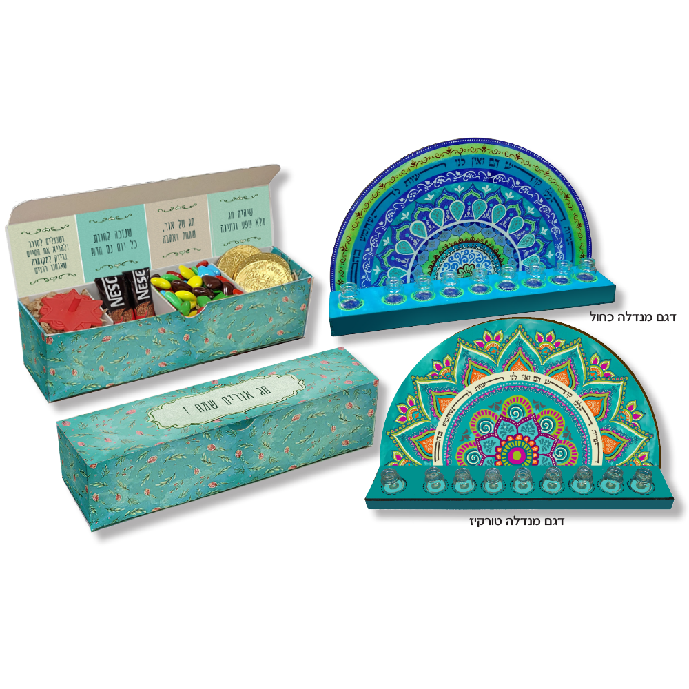 חנוכייה מעץ עם קני זכוכית ומארז ברכות לחנוכה המכיל