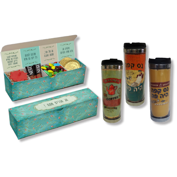 כוס טרמית ומארז ברכות לחנוכה המכיל 3 מטבעות שוקולד, עדשים, 2 שקיות נס קפה אישי וסביבון גודל המארז 20x5x5 ס”מ, מידת הכוס 20×7 ס"מ