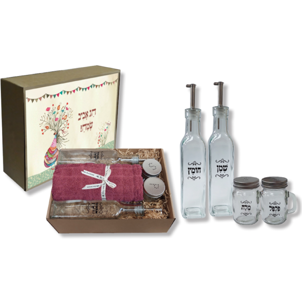 מארז המכיל 2 בקבוקים לשמן ולחומץ, מלחיה, פלפליה ומגבת מטבח גודל המארז 27×19 ס”מ, המגבת מגיעה בגוונים שונים בהתאם לקיים במלאי