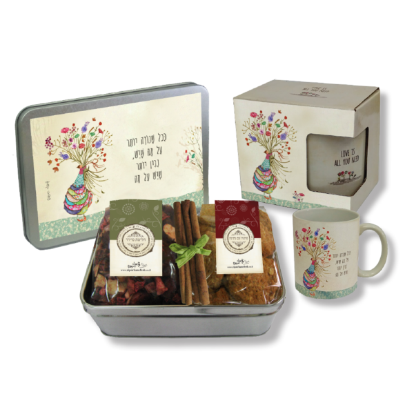 ספל במארז מעוצב ומארז פח עם 6 עוגיות, 100 גר' חליטת פירות ומקלות קינמון גודל המארז 5.2x10x14 ס"מ