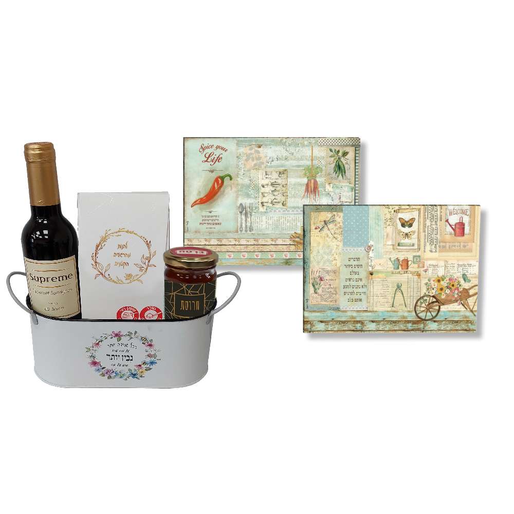 מארז חג עשיר בקופסת פח בגודל 20×9.5×10 ס"מ, המציע חוויה מתוקה ואלגנטית. הוא כולל בקבוק יין אדום איכותי בנפח 375 מ"ל, חרוסת חגיגית במשקל 120 גרם, מארז שוקולד לבן עם בוטנים וקרמל מלוח, וקרש חיתוך מזכוכית בגודל 35×25 ס"מ – פריט שימושי שמוסיף טאץ’ של פונקציונליות.