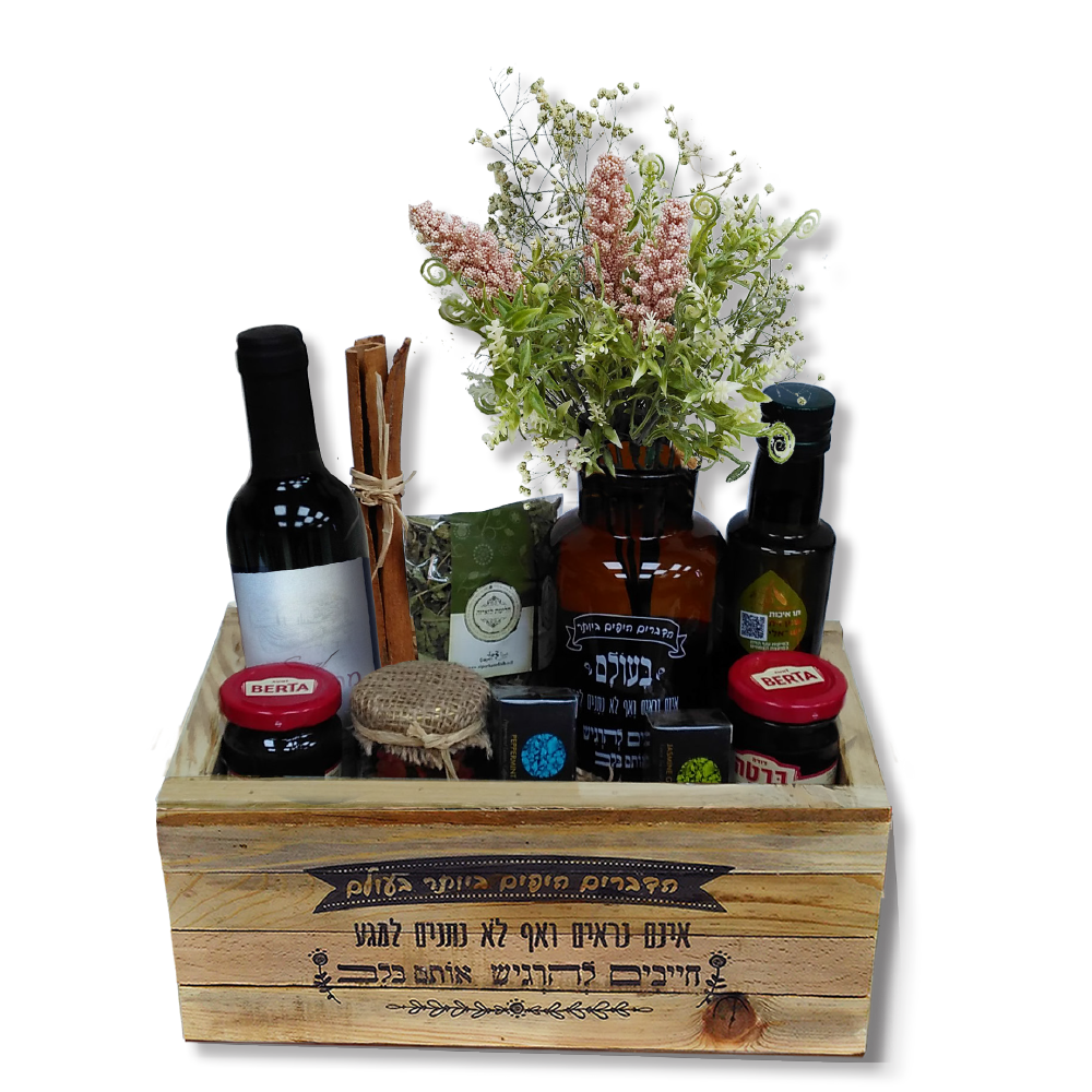 מארז עץ המכיל יין 375 מל',שמן זית 250 מל', אגרטל מזכוכית חומה עם פרחים מיובשים בשילוב עם צמחים מלאכותיים,