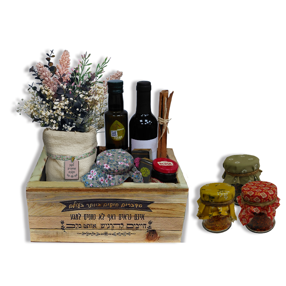 מארז עץ המכיל יין 375 מל',שמן זית 250 מל', עציץ בטון דמוי שק עם פרחים מיובשים בשילוב עם צמחים מלאכותיים,