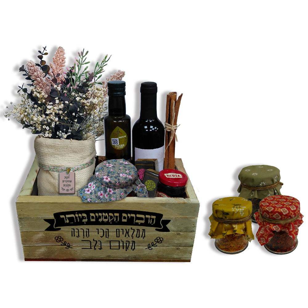 מארז עץ המכיל יין 375 מל',שמן זית 250 מל', עציץ בטון דמוי שק עם פרחים מיובשים בשילוב עם צמחים מלאכותיים,